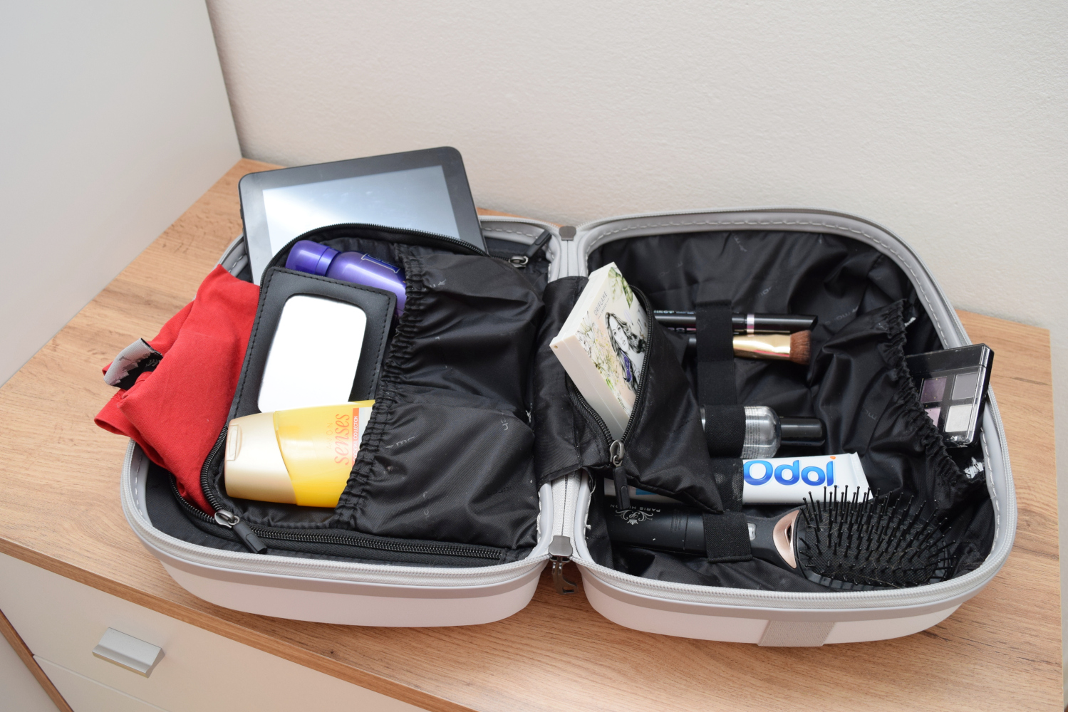 Párkrát jsem kosmetický kufřík použila jako druhé příruční zavazadlo na palubu letadla. V tom případě jsem do něj uložila tablet a kosmetiku v malých balení, přípustných na palubu letadla. Při odbavení pak stačilo kufřík pouze otevřít a nechat projet bezpečnostní kontrolou.