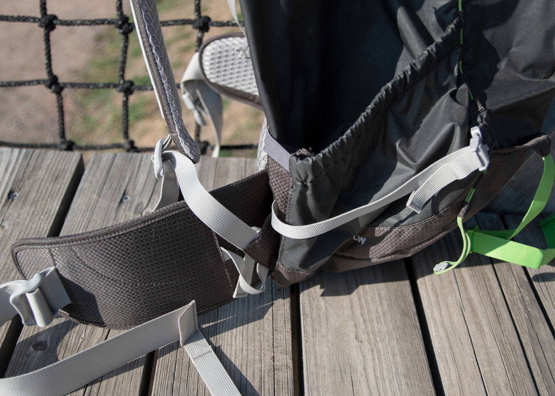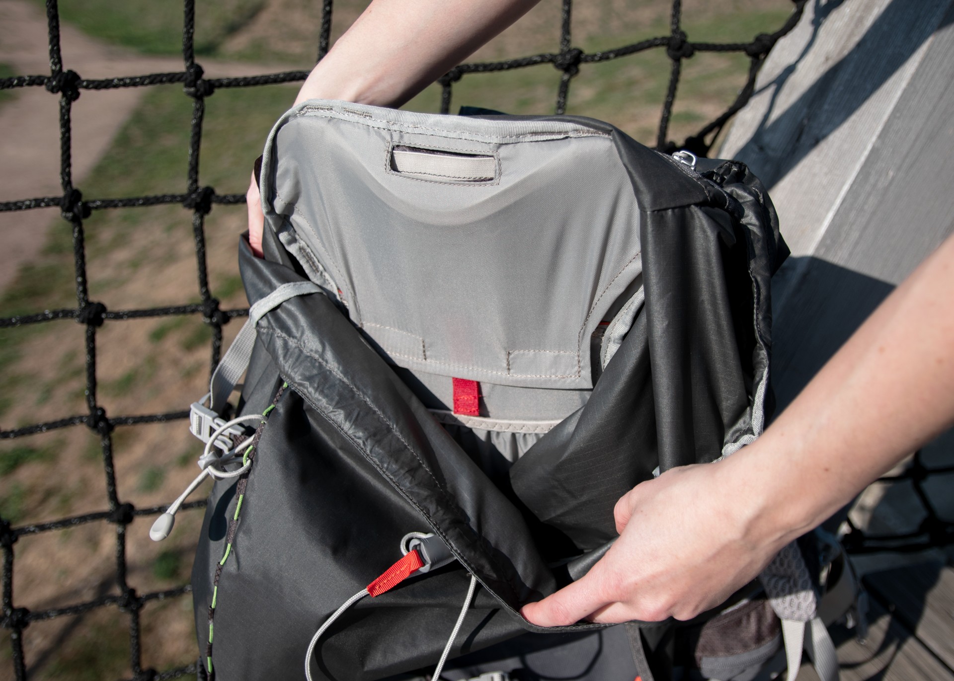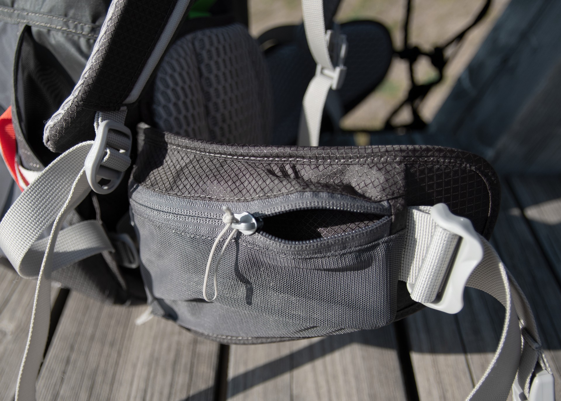 Extra velké a prostorné boční kapsy mají zajímavý design. Jedna je textilní s pružným lemem, takže je ideální na uložení objemnějších věcí, které si chci ponechat po ruce, ale nemusím se díky stahovací gumičce obávat toho, že při pohybu vypadnou ven. Druhá kapsa je síťovaná s přístupem zezadu pro pohodlný přístup a manipulaci jednou rukou. Díky velmi pružnému materiálu se do ní vejde i litrová láhev Nalgene Wide Mouth.