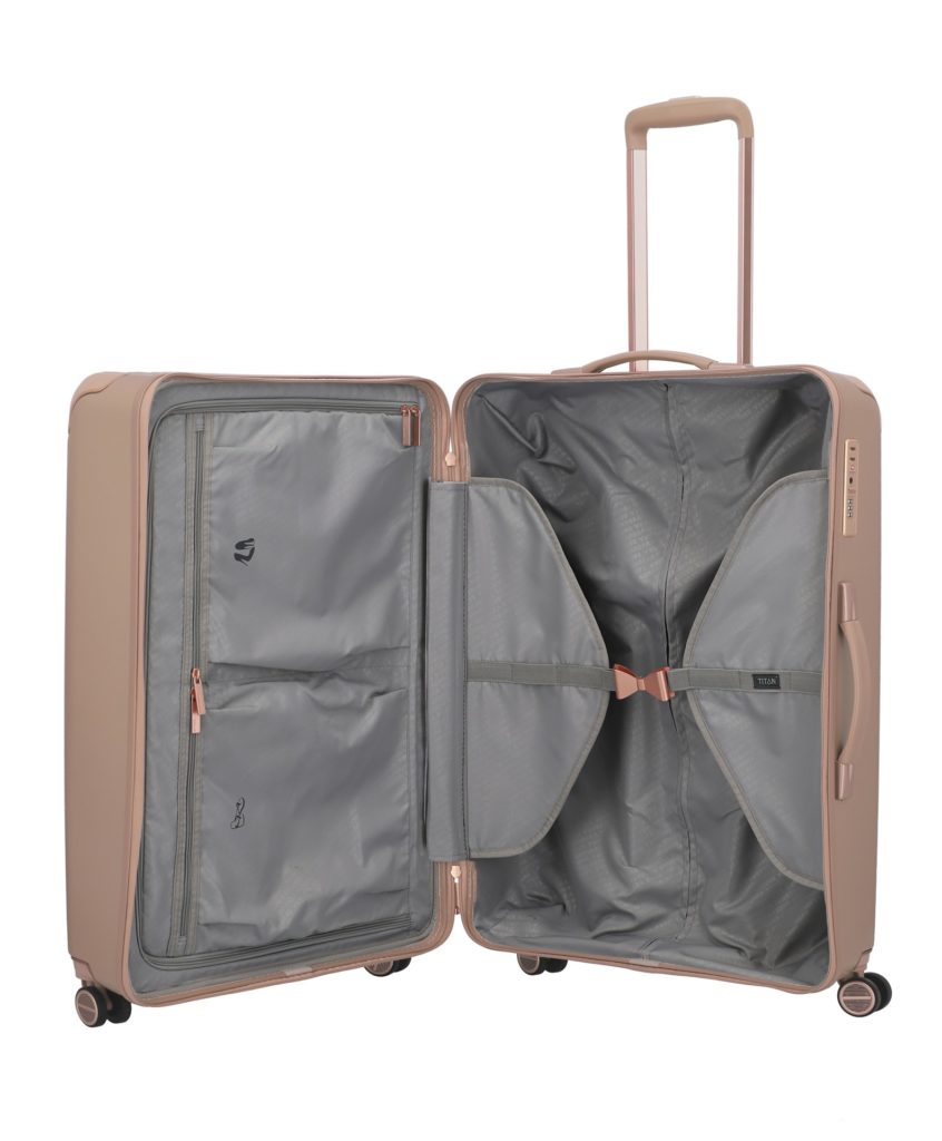 Textilní přepážka rozdělí kufry na dvě samostatné části. Fixační popruhy se stylovou přezkou ve tvaru mašličky a luxusní podšívka potěší stejně jako oddělená přihrádka na blůzku či šaty. Pohodlnou manipulaci pak zajistí čtyři otočná kolečka a odlehčené výsuvné madlo.